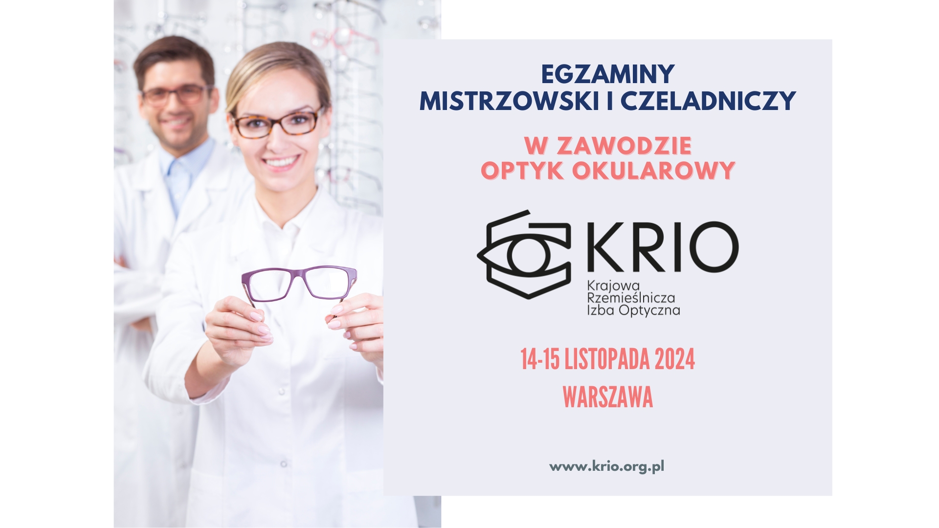Szanowni Państwo, w ramach sesji jesiennej, Krajowa Rzemieślnicza Izba Optyczna organizuje w dniach 14-15 listopada 2024 r. egzamin mistrzowski oraz egzamin czeladniczy w zawodzie OPTYK OKULAROWY. Osoby zainteresowane przystąpieniem do egzaminów prosimy o niezwłoczne przesyłanie zgłoszeń. Wszystkie informacje dotyczące wymaganych kwalifikacji, niezbędnych dokumentów,